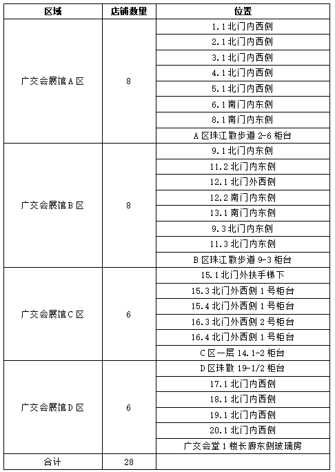 (1)招标内容:广交会展馆便利店分布于广交会展馆A、B、C、D四个区,共计28家(详见下表),主要服务于在广交会展馆场地范围内举办的各类展览活动的主、承办方,展、客商以及筹撤展工作人员。因日常运营需要,根据展览活动安排,需对展馆便利店临时用工开展采购工作,确保完成便利店的收银及商品配送工作。具体服务内容详见本项目招标文件用户需求书及合同文本等。